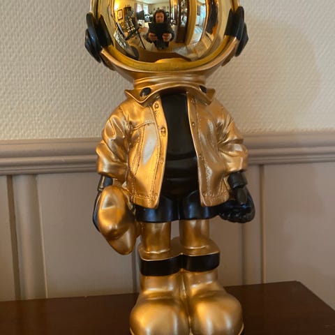 2 morsomme astronauter. Den store er ca.32 cm høy i sort/sølv, den lille er ca.25 cm høy i hvit/gull. Selges samlet kr.550. Kan sendes mot frakt kr. 135