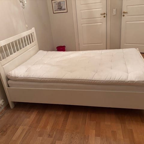 Seng i sort lettmetall med sengebunn og medrass selges rimelig.