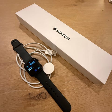 Apple Watch SE 40mm med gull aluminiumkasse og Starlight sportrem. Klokken har GPS-funksjon og leveres med flere remmer i rosa og gullfarget metall. Egnet for unisex bruk.