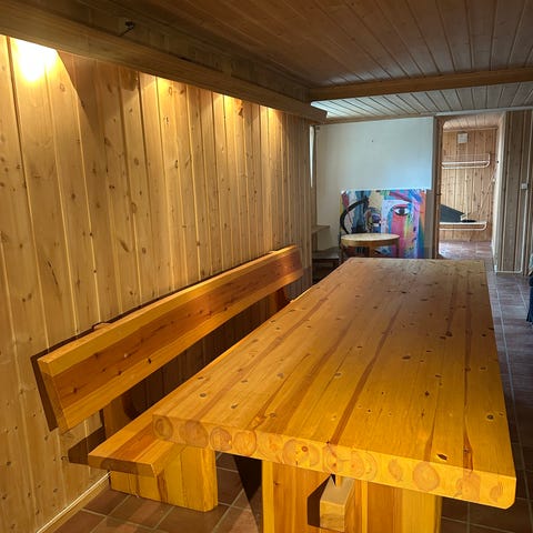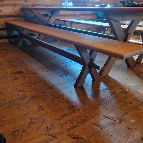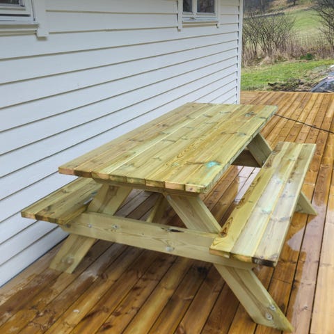 Spisebord med 2 Benker. Det følger med 2 puter som dekker hele benken og som festes med bårelås.