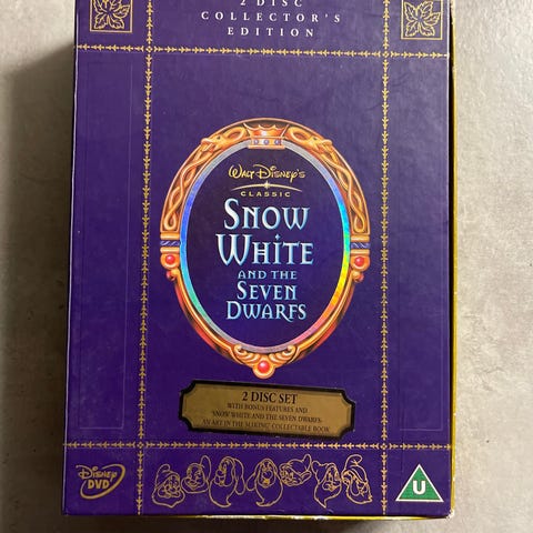 Walt Disney Snow White and the Seven Dwarfs DVD Collector's Edition. Inkluderer to DVD-plater med filmen og bonusmateriale. DVD-format, universell regionskode. Cover i farger med illustrasjoner fra filmen.