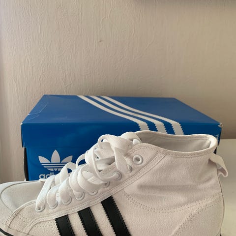 Adidas Nizza sneakers i størrelse 43. Joggeskoene er svarte med hvite detaljer og laget i tekstilmateriale. Modellen er høy på ankelen og har gummisåle. Egnet for daglig bruk og fritidsaktiviteter.