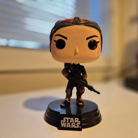 Star Wars Funko Pop figurer som inkluderer Mandalorian, Boba Fett og Wrecker Clone Trooper. Figurene er små samleobjekter med karakteristiske hoder og detaljer som representerer kjente figurer fra Star Wars-universet. Passer for samlere og fans av Star Wars.