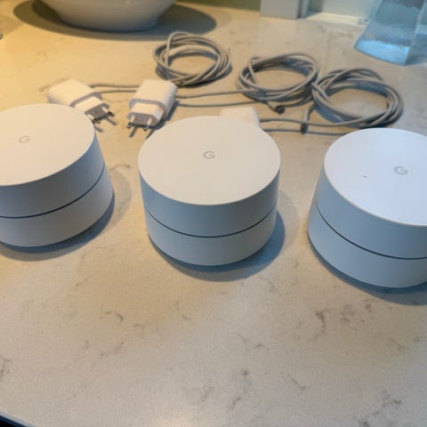 3 stk Google WiFi mesh-noder + et tak-/vegg-feste.