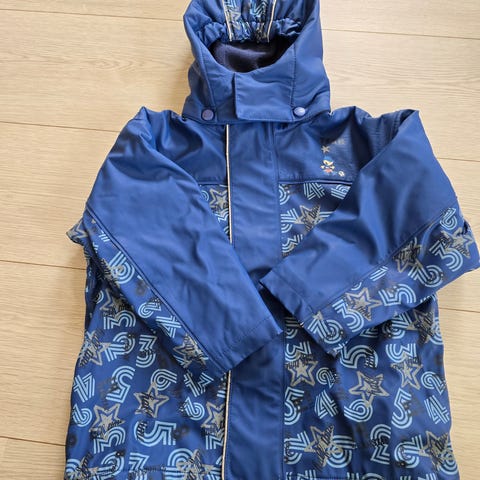 Fin og varm foret regnjakke fra Beauty and the bib. I veldig god stand, mye bruk igjen. Den har noen små flekker (se bilde), ellers ingen bruksmerker som jeg kan finne.