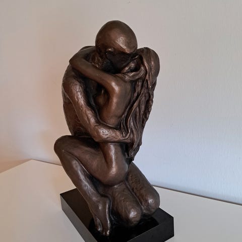 Dekorativ bronsefarget skulptur av et par i omfavnelse. Fin detaljrik modellering og varm patina.
