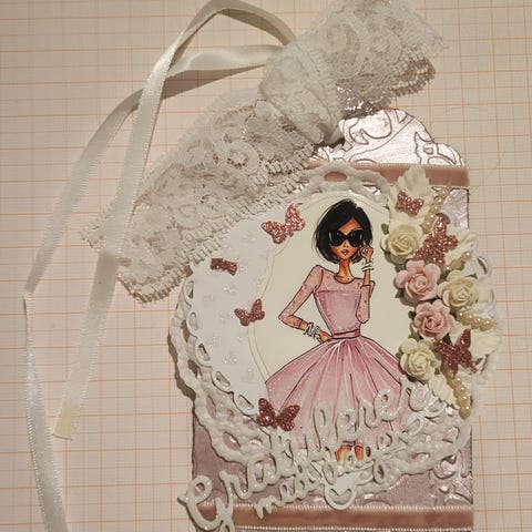 Håndlaget dekorativ hengende tag laget av teksturert papir med blonder, små blomster, perler og en sommerfugldetalj. Taggen har en hvit kremfarge og kommer med en metallkjede for oppheng. Passer som dekorasjon eller gaveetikett.