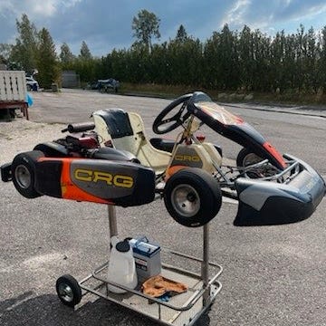 Go-Kart med ramme i metall, motor, seter og fire hjul. Egnet for reparasjon eller som basis for bygging av go-kart. Farge på rammen er svart. Motoren er montert bak, og dekkene er terrengdekk. Setet er enkelt og laget for én person.