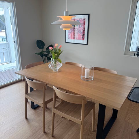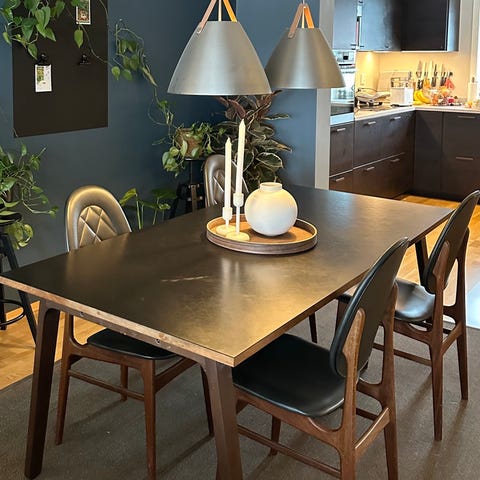 EM table designet av den franske ingeniøren Jean Prouve i 1950, produsert av Vitra. Bordplate: Hpl Laminat farge: Asphalt understell: Pulverlakert metall, farge, Basalt.Pent brukt i leilighet. Selges grunnet overgang til ett annet spisebord. Pris kan diskuteres ved rask avgjørelse.