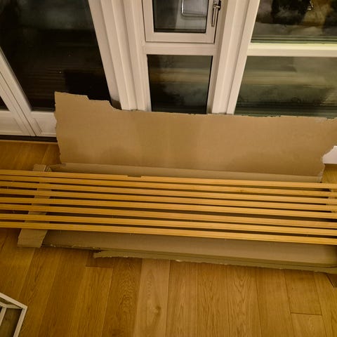 Det sitter i spikere og er noe støvete på baksiden, som ikke vil bli fjernet/gjort noe med før salg.