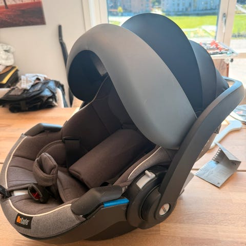 MaxiCosi iSize bilsete med nyfødt innlegg selges uten base. Kan festes med sikkerhetsbeter i bilen og kan settes på flere ulike vogn-baser. Perfekt som bilstol nr.2 hos besteforeldre eller lignende.