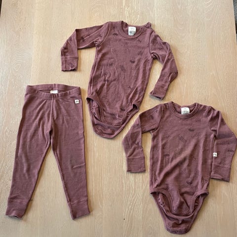 Bukse str 80 og bodyer i str 80 og 86. Ikke stor forskjell på størrelsene. Slitasje på hummel logo på body og bukse. Lite hull ved knappen i halsåpningen på hver body (se bilder). Ellers mye bruk igjen:)