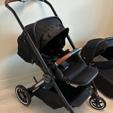 Silver Cross komplett barnevognsett bestående av en barnevogn med justerbart håndtak og stor oppbevaringskurv, en bærebag med solskjerm, et bilsete med sikkerhetssele og en bilstolbase med støtteben. Settet er svart og laget i slitesterkt materiale. Passer for småbarn og gir mulighet for trygg transport både til fots og i bil.