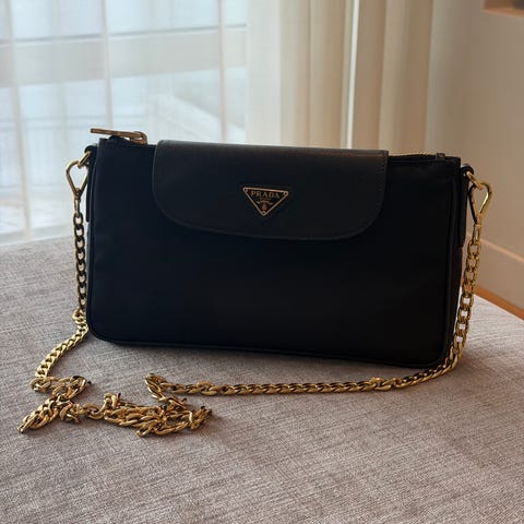 Prada crossbody bag in nylon and leather strap. It’s in good used condition and have some visible signs of used. In gold hardware, there is some discoloration on the hardware zippers and strap, but doesn’t affect the functionality of the bag.