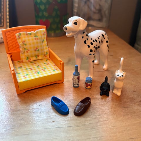 Håndlaget ullhest med føll laget av svart og hvit ullmateriale. Hesten har lang hvit man og hale med brunt skinnbånd som seletøy. Føllet er mindre i størrelse med samme fargekombinasjon. Passer som dekorasjon eller samlerobjekt. Hesten er ca 28cm lang. Føllet er ca 12cm lang.