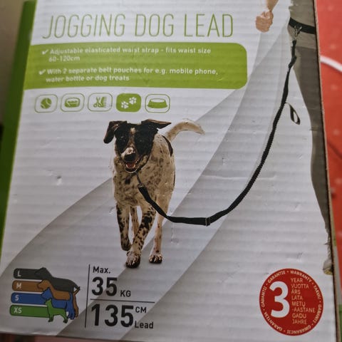 Jogging Dog Lead justerbart elastisk bånd med omkrets 50-120 cm, egnet for hunder opptil 35 kg. Leveres med to separate vesker for små gjenstander som mobiltelefon og nøkler. Lengde på båndet kan justeres mellom 100-135 cm. Utstyrt med refleksdetaljer for økt synlighet. Ikke egnet for barn.
