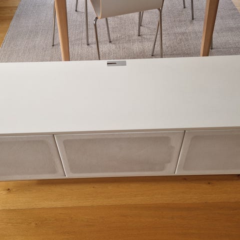 Hele fronten har høyttalerstoff, slik at du kan skjule høyttalere bak uten at lyden dempes.
