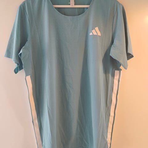 Pustende, fukttransporterende, hurtigtørkende t-skjorte fra Adidas. Normal passform. Logoen på den jeg selger er i sølv og plassert midt på.
