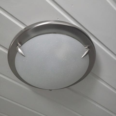 Taklampe til badet med rustfritt stål ramme og hvitt glass. Lampen har IP54-klassifisering som gjør den egnet for bruk i fuktige miljøer.