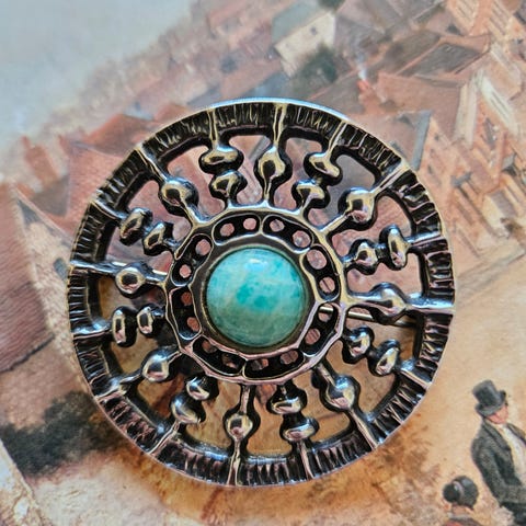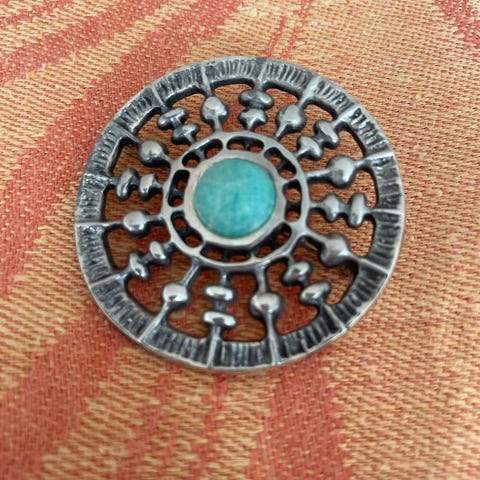 Designet av Unn Tangerud og heter "Snekrystall". Anvendelig ettersom det kan brukes som nål eller som anheng.