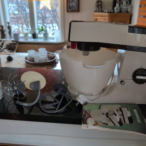 Kenwood major med alt du kan tenke av tilleggsutstyr, inkludert forskjellige kroker, blender og kjøttkvern. Maskinen er eldre men var ubrukt for inntil 5 år siden. Tilleggsutstyr som blender, kjøttkvern, rasper/kutter osv har aldri vært brukt. Her får man masse maskin og utstyr for pengene. Bud vurderes mot hurtig henting
