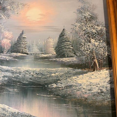 Maleri av kunstneren Ivan Jelagin. Maleriet er svært fargerikt og uttrykksfullt, innrammet under glass, og har tidligere hengt i et galleri. Rammen har noen små feil, men de synes ikke når maleriet henger på veggen. Rammen kan enkelt byttes ut for å passe interiøret.