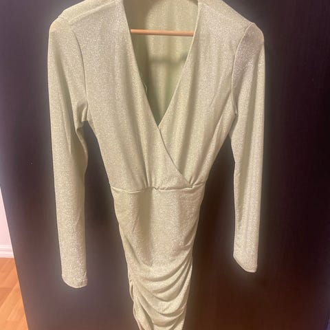 Bik Bok Festkjole i størrelse S med gullfarge. Kjolen har korte ermer og er dekorert med store paljetter som gir et glitrende utseende.
