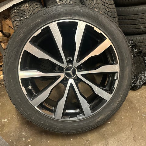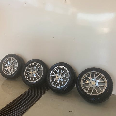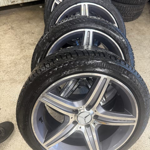 Komplette hjul med vinterdekk i dimensjon 225/55 R18 stått på Mercedes S-klasse