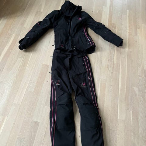 Todelt kvalitetsdress til fra Jofama. Pent brukt. Brukt av dame i str 34. Avtagbart fôr i jakken. Kan fås komplett med ryggskinne og støvler i str 36 for kr 3000 (se mine andre annonser).