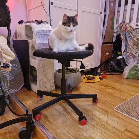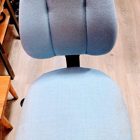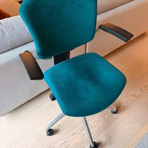 Stolen er i pent brukt stand. Det er noen synlige bruksmerker på setet, som trolig kan fjernes med en vask. Utover dette fremstår stolen som hel, funksjonell og komfortabel, uten skader på stoffet som påvirker bruk eller holdbarhet.