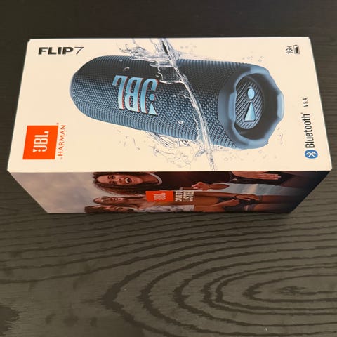 JBL Flip 7 Bluetooth høyttaler i svart farge. Bærbar med vanntett design og innebygd oppladbart batteri. Støtter trådløs tilkobling via Bluetooth for avspilling av lyd. Kompakt størrelse som er enkel å ta med på farten.