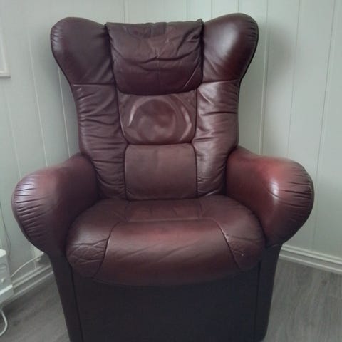Meget behagelig stol i Blått skinn og tredetaljer selges.
