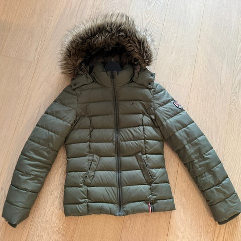 Kort og varm dunjakke. Fin grønnfarge og god størrelse. Hemper på siden som gjør at man kan tilpasse. Nypris 2000