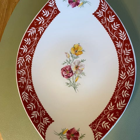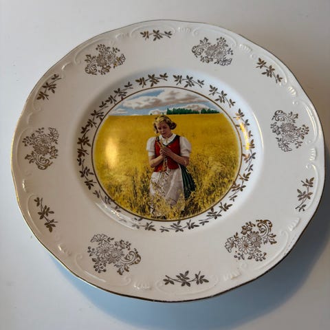 Jeg selger dette pene fatet fra Figgjo flint. Det har et motiv av ei jente i bunad i en kornåker. Fine detaljer i gull rundt kanten.
