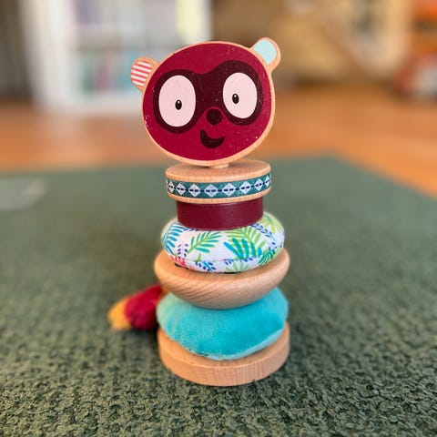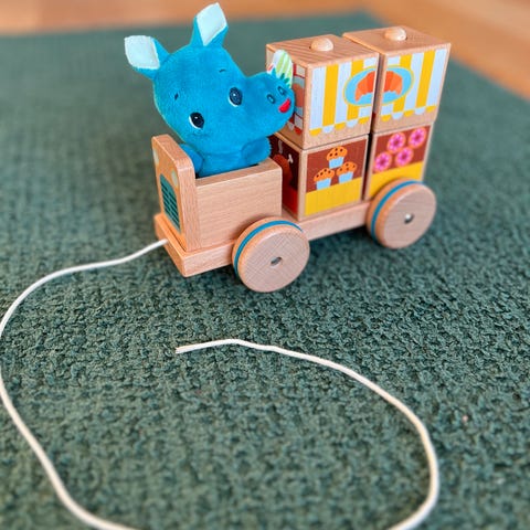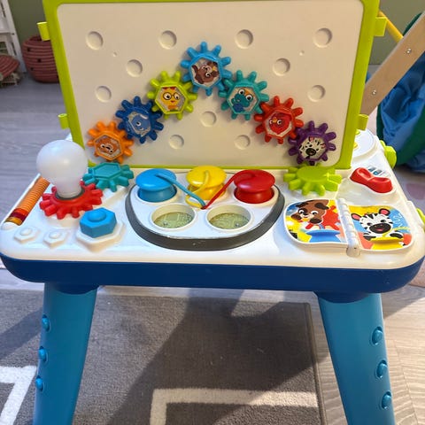 Aktivitetspanel som er helt konge for små barn (9-24 mnd). Vi har brukt den masse på lange flyturer (for den er så enkel å ha med), men og en del hjemme. Den er mye brukt, men fremstår i overraskende fin stand. Jeg ser ingen anmerkninger bortsett fra noen små riper i treverket. All farge er inntakt. De myke delene kan tas av og vaskes 😊