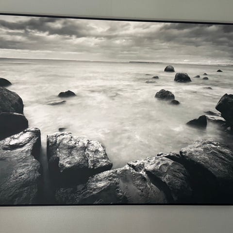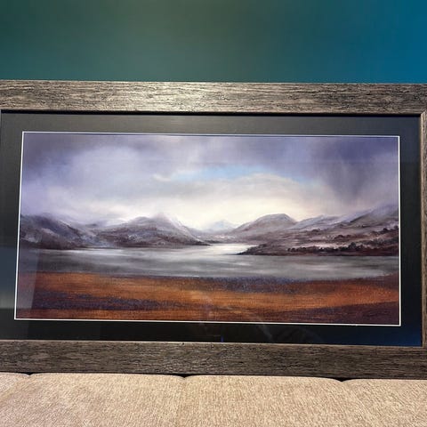 Pent veggbilde kjøpt hos Skeidar. Flott fjell- og vannmotiv i varme toner. Robust ramme i rustikk tre-look med glassfront. I svært god stand.