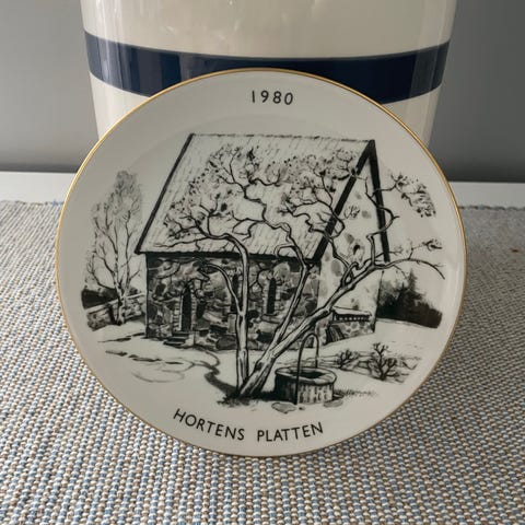 Civitan Club Hortens Platten dekorativ tallerken fra 1984. Tallerkenen har svart-hvitt motiv av en borg med tårn og flagg, samt teksten "Hortens Platten". Diameter ca. 18cm. Produsert i porselen med dekorativ gullkant. Egnet for samling eller utstilling.