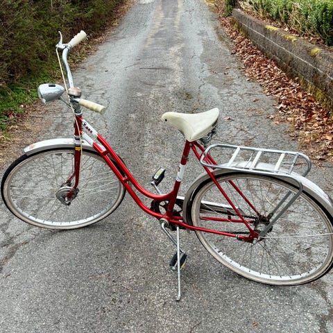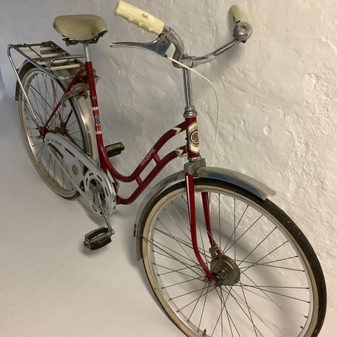 DBS Damesykkel i rød farge. Merket Jonas Øglænd, made in Norway. Sykkelen har et tradisjonelt design med lav innstigning, egnet for «damebruk» og skjørt/kjole. Den har standard hjulstørrelse og er laget i metall. Passer til daglig bruk og transport. Ingen gir. Trolig fra 1970 eller deromkring. Ikke brukt på flere tiår, så denne trenger nok en overhaling. Stått tørt på låve til stormen Amy knuste låven, men ikke sykkelen