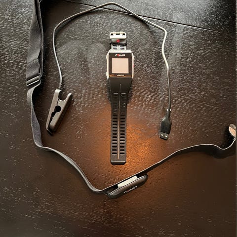 Pulsbelte følger dessverre ikke med, men om du har et slikt (eller kjøper på Finn) så har du en fullverdig treningsklokke som kan kobles på nett med Polar sin Flow software