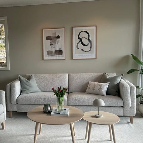 Lys farge med hint av beige. Knirker litt i det man setter seg på den. Fin å kombinere med feks en mørkere sofa.