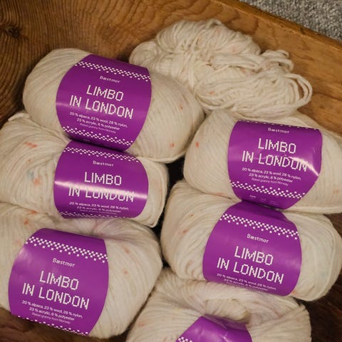 antageligvis blanding av merinoull og nylon. Buntene er ca 14 cm høye og ca 13 cm i diameter