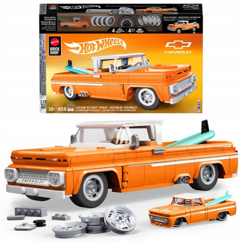 Eksklusiv støpt bil og signaturplate i metall: Har en matchende metallbil i skala 1:64 og signaturplate, tilgjengelig først med Mattel Brick Shop-sett.