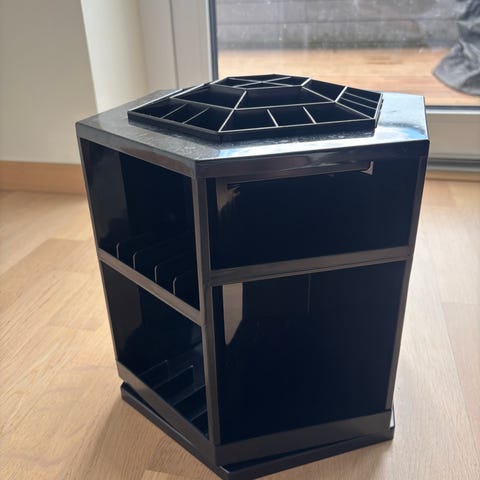 Akryl sminkestativ med flere rom for organisering av sminkeprodukter som leppestifter, børster og små kosmetikkartikler. Gjennomsiktig materiale, kompakt design som passer på bad eller sminkebord.