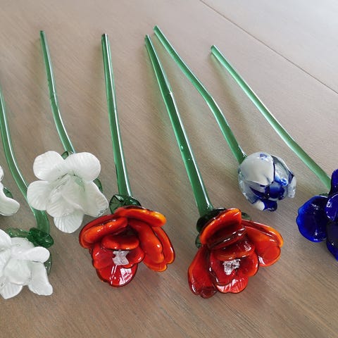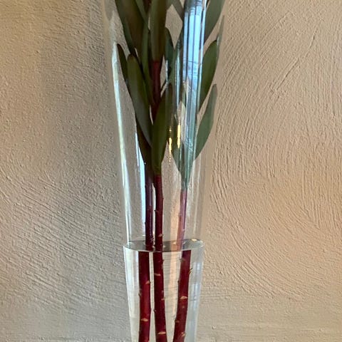 Glassvase med kunstige blomster. Kan sendes mot forskuddsbetaling via Vipps, 129 kr i tillegg. Kan sendes på kjøpers regning og risiko, men pakkes godt med bobleplast.