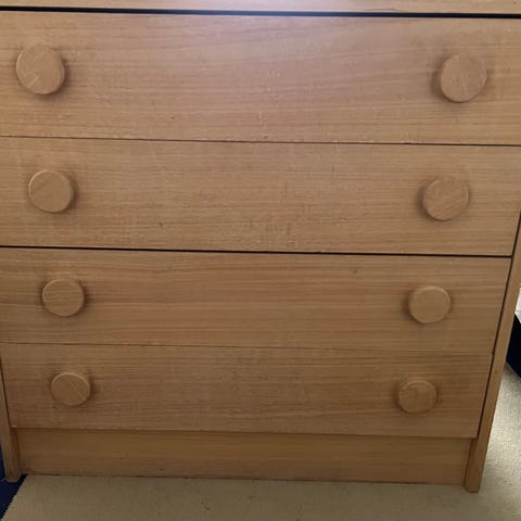 Koselig liten hvitmalt kommode. Hull etter skruer i toppen som kan tettes og males over.