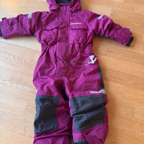 Fin Didriksons høst- og vinterdress i størrelse 120. Vanntett materiale. Mangler hette og én av fotstrikkene. Begge deler kan lett settes på, om man har ekstra hjemme.