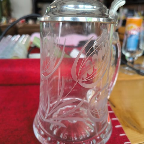 Flott utsmykket krus med lokk i glass og metall med glassdekor. Flott til bruk eller pynt. Har ikke vært brukt. Høyden er ca 17cm.