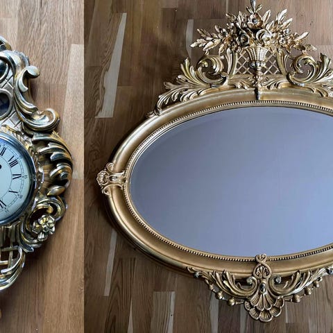 Antikk veggklokke laget i gullfarget metall med dekorative detaljer som blomster og bånd. Klokken har en rund urskive med svart tallmarkering og to nøkkelhull for opptrekk. Passer til veggmontering og har et klassisk design.