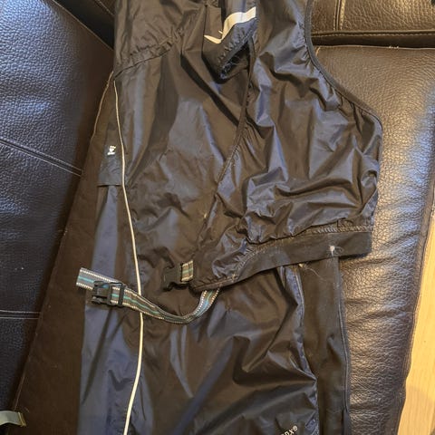 Hurtta heldress 45 cm, regntett i fargene rød, svart og brun. Den har elastiske detaljer og kan justeres for best mulig passform. Ren og fri for hundehår.