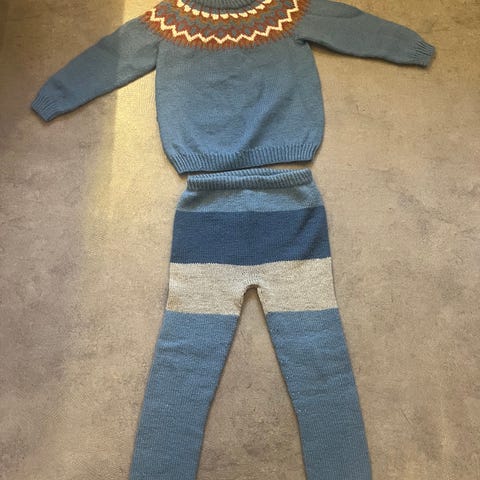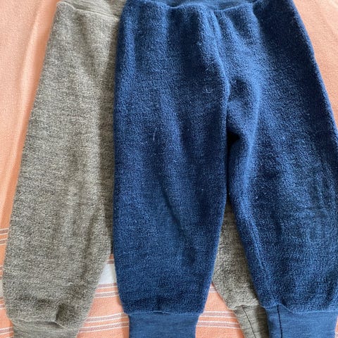 To tykke,hjemmestrikkede bukser. Perfekt for å ha under utebuksa en kald vinterdag.